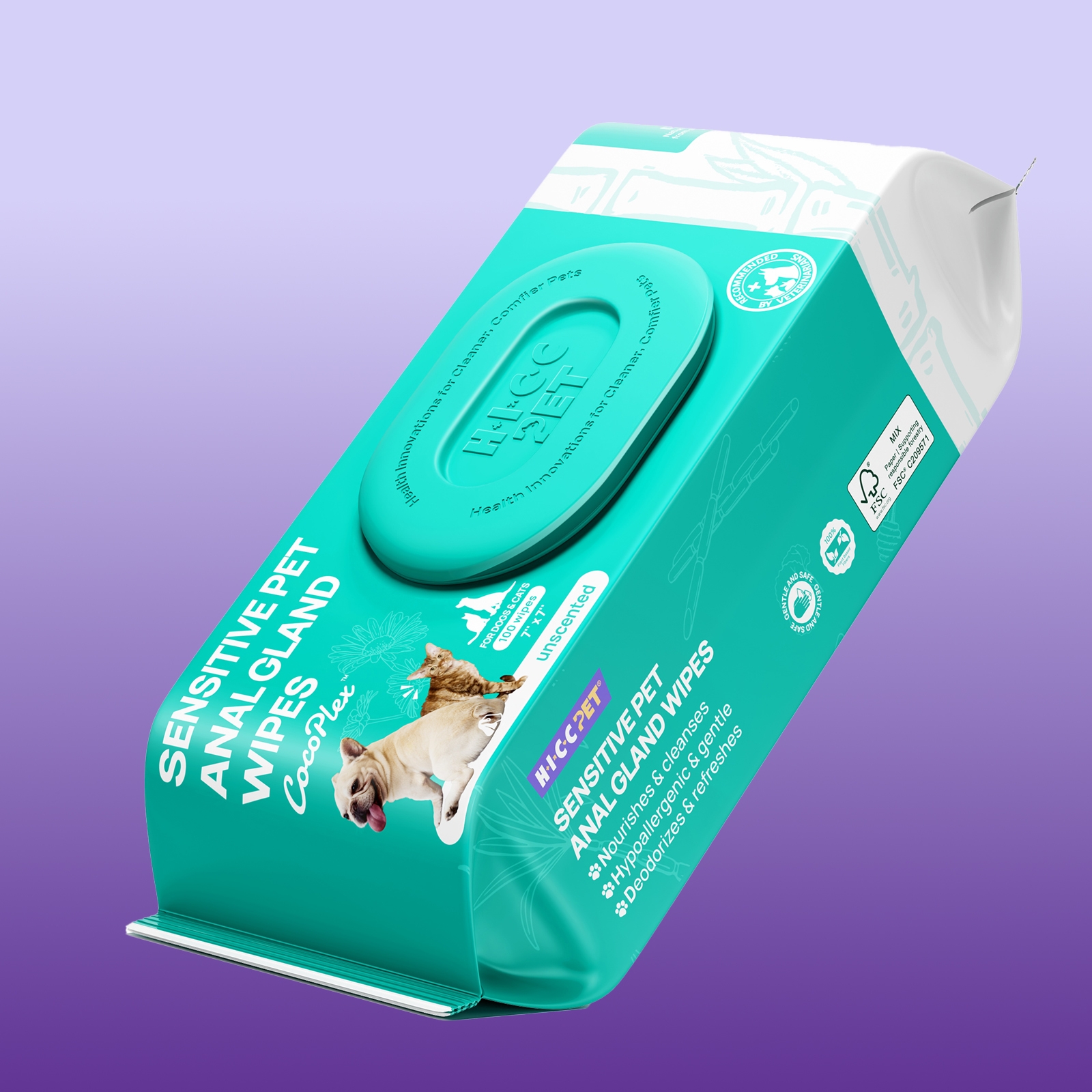 HICC PET® Pet Anal Gland Wet Wipes contain fermented coconut oil and DeoPlex®, highly moisturizing and effective at eliminating unpleasant odors.