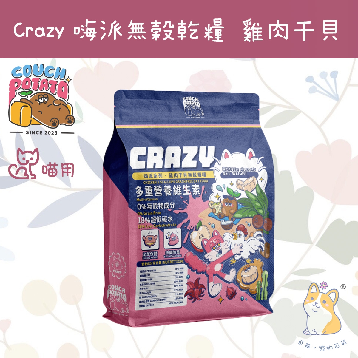 沙發馬鈴薯Crazy嗨派無穀乾糧|干貝雞肉;『海陸蛋白雙饗宴~鮮啦!CP值超高!』; 高含肉量85%,18%超低碳水,無穀物添加; 添加必需胺基酸、牛橫酸; 絲蘭萃取物,減緩糞便臭味; 腸道益生菌,建立良好腸道菌叢; 蔓越莓 & 洛神花萃取物,膀胱泌尿雙守護; #泌尿保健 #腸道保健 #便便不臭臭配方
